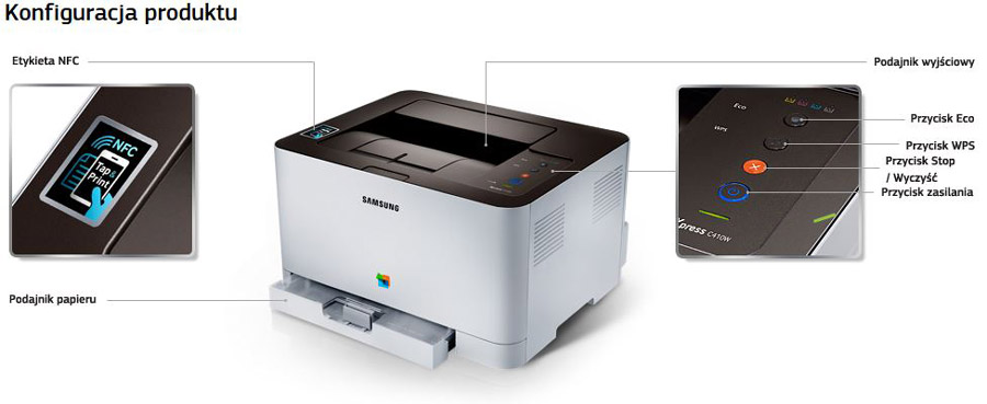 Drukarka, która rozszerzy możliwości twojego smartfona Drukuj bezprzewodowo i udostępniaj bez wysiłku za pomocą drukarki Samsung Xpress. Dzięki zaawansowanej technologii NFC, łączu Wi-Fi Direct i wysokiej kompatybilności urządzeń funkcje te dostępne są za jednym dotknięciem. Wystarczy jedno dotknięcie ekranu dotykowego urządzenia przenośnego, aby za pomocą drukarki Samsung Xpress C410W wydrukować cokolwiek zechcesz. |