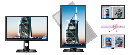 Auto Pivot wykrywa obrót monitora i dynamicznie (automatycznie) obraca wyświetlane treści. Wszystkie okna będą wyświetlane w równej porcji na ekranie monitora zaraz po kliknięciu na ikonę znajdującą się na pulpiciei, a cały proces pozwala porównać wszystkie prace projektowe za pomocą tylko jednego kliknięcia.