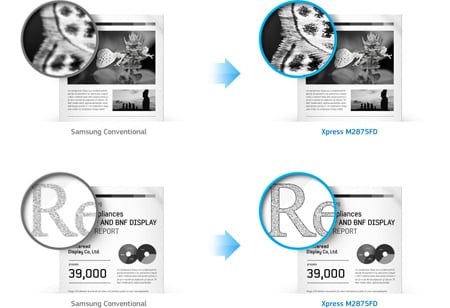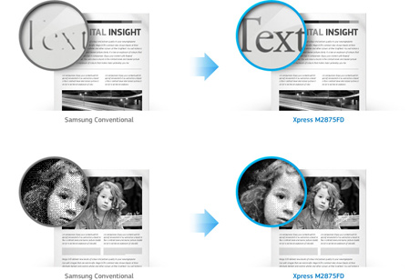 Drukarka Samsung Xpress M2875FD zapewnia niezwykłą jakość kopiowania i skanowania. Wysokie parametry pracy przekładają się na wyraźny tekst i obrazy, sprawiając, że tekst jest czytelniejszy, a obrazy żywsze i wygładzone.