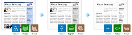 Tnij koszty tonera i papieru dzięki przyciskowi Eco. Ten optymalny przycisk umożliwia szybkie uruchamianie trybu drukowania kilku stron na jednym arkuszu i drukowania dwustronnego oraz pomijanie pustych stron. W trybie oszczędzania tonera można jeszcze bardziej obniżyć koszty druku poprzez mniejsze zużycie tonera.