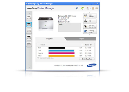 Oprogramowanie Samsung Easy Printer Manager pozwala łatwo kontrolować ustawienia drukarki i stan urządzenia, zamawiać materiały eksploatacyjne i wysyłać faksy – wszystko to za pośrednictwem jednego interfejsu. Możesz wygodnie przeglądać raporty dotyczące błędów i sprawdzać stan drukarki oraz materiałów eksploatacyjnych, a także zdalnie zmieniać ustawienia. Jeden interfejs łączy w sobie wszystkie ustawienia drukarki i związane z nią aplikacje.