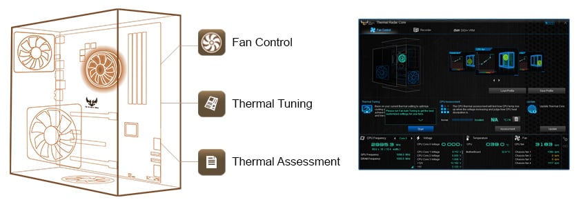 Thermal Radar Core Kompleksowe chłodzenie systemu, regulacja wentylatorów ASUS TUF Thermal Radar Core umożliwia pełne zarządzanie chłodzeniem systemu — szybko, łatwo i bezpiecznie. Kontrolki pozwalają na regulację szybkości wentylatorów tak, by temperaturę można było ustalić jednym kliknięciem. A skoro mowa o prostocie jednego kliknięcia: dzięki aktualizacjom Thermal Radar Core nigdy nie jest przestarzały — wystarczy kliknąć przycisk, by poszukać aktualizacji. ![]() |