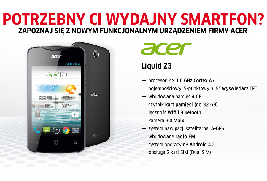 Telefon REWELACYJNY. W smartfonach do 500zł bije na łeb wszelkie samsungi, lg i soniaki. Acer wyposażył go w świetne dodatki do Androida (np. Float Caller), które przy okazji niczego nie psują. Rozdzielczość wcale nie jest taka zła jak mówią niektórzy recenzenci, swobodnie można przeglądać sieć, Aero2 działa jak marzenie. Na baterii 3 dni to standard. Do tego spece zrobili już roota, dostępny na XDA. Polecam, w kwestii budżetowych smartfonów jest to najlepsza opcja.