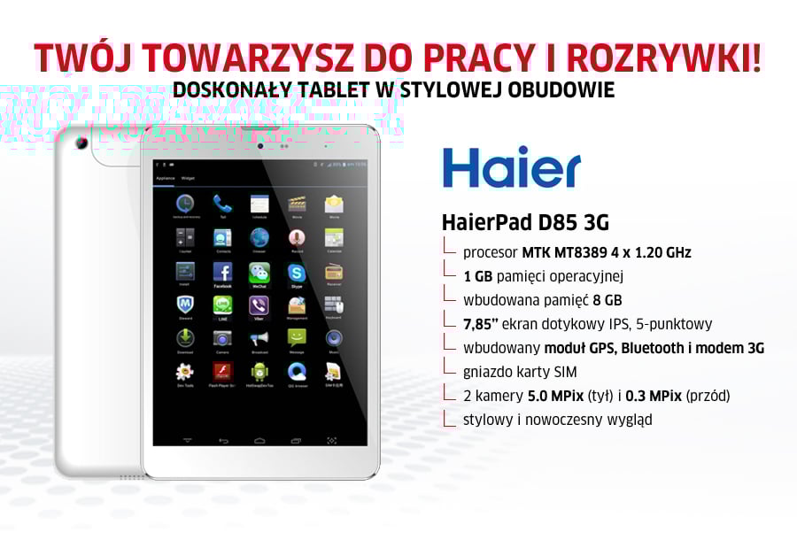 Haier D85 to pierwszy tablet jaki kupiłem i... jestem niezwykle z niego zadowolony! W tej cenie zarówno wygląd, jak i wydajność tego urządzenia jest bardzo atrakcyjna. No i przede wszystkim 3G. Jedyny minus to troszkę słaby głośnik, ale z drugiej strony: to tablet, a nie zestaw 5.1 surround:)