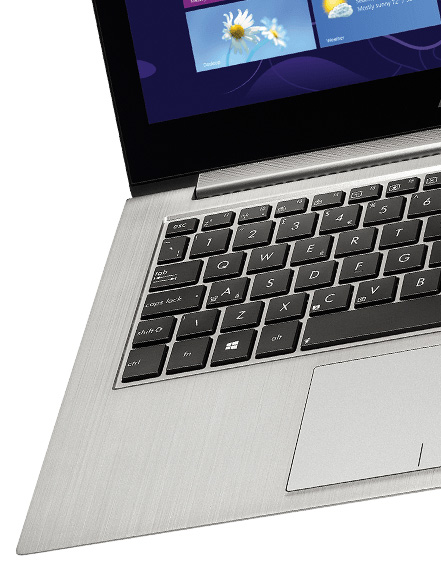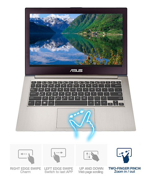 Zenbook wyposażono również w wielodotykowy touchpad, dzięki czemu możesz korzystać z gestów Windows 8 bez podnoszenia rąk od klawiatury, co jeszcze bardziej zwiększa produktywność. Touchpad posiada te same proporcje 16:9, co wyświetlacz, co zwiększa precyzję kontroli wskaźnika. Touchpad został też znacznie powiększony, aby dać użytkownikowi więcej miejsca na wykonywanie gestów. Nawet przyciski zostały wbudowane w touchpad, aby dać użytkownikowi jak najwięcej miejsca na palce i aby zapewnić komfort. Technologia ASUS Smart Gesture umożliwia zbliżanie/oddalanie i przewijanie za pomocą palców,