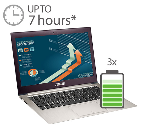 Wydajne komponenty, takie jak procesor Intel® Core™ i dysk SSD sprawiają, że Zenbook jest w stanie pracować na baterii przez 7 godzin*. Użytkownik może wykonać całodniową pracę na jednym ładowaniu. Ekskluzywna technologia Super Hybrid zwiększa czas pracy na baterii o 25% w przypadku mniej wymagających zadań.