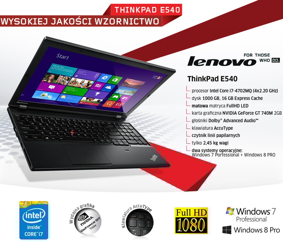 Nagradzana klawiatura zoptymalizowana dla Windows 8 Pełnowymiarowa i odporna na rozlanie legendarna ergonomiczna klawiatura stosowana w serii ThinkPad jest znana z pełnego zestawu klawiszy, doskonałego wrażenia w dotyku oraz urządzenia wskazującego TrackPoint®. Teraz dostosowana do systemu Windows 8 i wyposażona w wygodne przyciski multimedialne, możliwość blokady funkcji oraz natychmiastowy dostęp do otwartych aplikacji. Dodatkowo większy panel TrackPad o płynnym działaniu z obsługą pięciu punktów dotykowych, który można skonfigurować na wiele sposobów. Do 6 godzin pracy na zasilaniu bateryjnym Możesz pracować niemal cały dzień bez potrzeby podłączania ładowarki. Doskonała jakość konferencji internetowych / Optymalizacja pod kątem komunikacji VOIP Kamera internetowa 720p HD gwarantuje lepszą jakość obrazu przy słabym oświetleniu oraz szerokie kąty widzenia. Ponadto posiada funkcję śledzenia twarzy oraz dwa mikrofony z funkcją wyciszania niepożądanych odgłosów, tak by zapewnić właściwy przebieg konferencji internetowych. Z kolei klawisze multimedialne umożliwiają szybką zmianę ustawień mikrofonu, głośników i kamery. Lenovo Solutions for Small Business Unikalne rozwiązania w zakresie zabezpieczeń i poprawy wydajności oparte na platformie Intel® Small Business Advantage przeznaczonej dla małych i średnich firm, w tym: planowanie automatycznej konserwacji poza godzinami pracy, monitorowanie oprogramowania, blokada portów USB, oszczędzanie energii i proste tworzenie kopii zapasowych aplikacji i ich przywracanie. Wbudowany czytnik linii papilarnych Uzyskaj szybki dostęp do aplikacji i ciesz się bezpiecznym logowaniem za jednym pociągnięciem palca. Dolby® Advanced Audio™ Ten pakiet technologii audio pozwala na uzyskanie czystego i wyrazistego dźwięku przestrzennego z wbudowanych głośników stereo. System zapewnia optymalną jakość dźwięku podczas komunikacji VoIP, dużą głośność bez zniekształceń oraz pomaga uwydatnić dialogi podczas oglądania filmów. Przechowywanie danych w chmurze Lenovo Cloud Storage Chroń kluczowe dane i korzystaj z szybkiego i wygodnego dostępu do informacji i udostępniania plików. Automatycznie twórz kopie zapasowe i synchronizuj dane w całej firmie, uzyskując dostęp z poziomu wielu urządzeń. W celu dodatkowego zabezpieczenia danych, podczas transferu są one szyfrowane. Nowa technologia Lenovo OneLink Uzyskaj więcej ze swojego kabla zasilającego! Technologia OneLink to unikalny interfejs, który ułatwia podłączanie laptopa dzięki użyciu jednego kabla oraz stacji dokującej ThinkPad OneLink Dock. Stacja OneLink Dock zapewnia dodatkowe złącza wideo, USB 3.0, gniazdo sieci Gigabit Ethernet oraz złącza audio oraz umożliwia ładowanie laptopa. Laptop ThinkPad Edge E540 jest jednym z pierwszych laptopów wyposażonych w tę innowacyjną funkcję. |