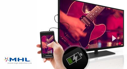 Jeden z portów HDMI obsługuje standard MHL (Mobile High-Defintion Link) pozwalający na uzyskanie połączenia o wysokiej jakości między urządzeniem przenośnym a telewizorem. Jeśli więc masz telefon lub tablet ze złączem w tym standardzie, możesz podpiąć go do telewizora i odtwarzać zawartość ekranu urządzenia bezpośrednio na ekranie telewizora. Nawigacja za pomocą pilota telewizora nie sprawia żadnych trudności, a problemy z baterią to już przeszłość — po podłączeniu telefon jest też ładowany. |