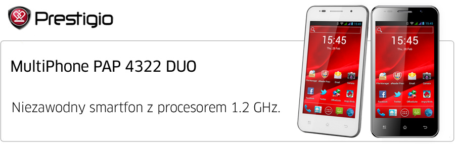 Osiągnij kolejny poziom stylu urządzeń przenośnych i mocy Potężna wydajność dwurdzeniowa umożliwia korzystanie z najnowszych gier o znakomitej grafice oraz płynne nawigację, przeglądanie stron internetowych i oglądanie filmów HD. Rozpocznij inteligentne życie ze smartfonem PRESTIGIO MultiPhone 4322 DUO, specjalnie zaprojektowanym dla młodych, dynamicznych użytkowników technologii przenośnej, którzy chcą pozostać w kontakcie podczas podróży. Możesz cieszyć się wszystkimi funkcjami smartfona z systemem Android, w tym znakomitymi aplikacjami, szybszym pobieraniem plików, łącznością z siecią Wi-Fi oraz bardziej intuicyjnym i bardziej atrakcyjnym interfejsem użytkownika. |