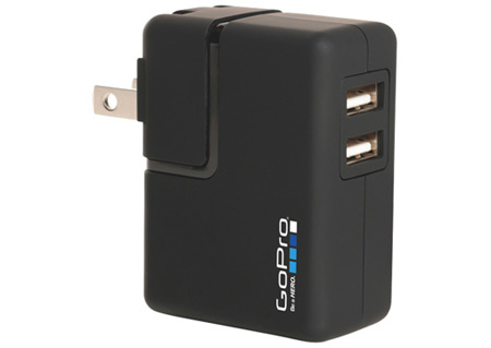 | Ładowarka ścienna USB pozwala ładować dwie kamery GoPro jednocześnie, oferujący przy tym do 2x szybsze ładowanie niż za pomocą kabla USB i komputera. Zestaw zawiera wymienne wtyczki do gniazdek występujących na terenie USA, Wielkiej Brytanii, Unii Europejskiej i Australii. |