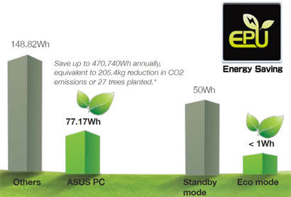 EPU – 40% oszczędności energii Stosowany wyłącznie przez ASUS-a układ EPU jest pierwszym w świecie kontrolerem oszczędności energii w PC, który optymalizuje efektywność przez wykrywanie obciążenia CPU w czasie rzeczywistym i oszczędza do 40% całkowitego poboru mocy. Instant On - natychmiastowa gotowośćStosowana wyłącznie przez ASUS-a natychmiastowa gotowość Instant On umożliwia uzyskanie oszczędności energii na poziomie 98% trybie Eco i jednym klawiszem bez trudu przywraca Twoje aplikacje dokładnie do stanu, w jakim zostały zostawione. To także dodatkowe zabezpieczenie danych na dysku przed zanikami zasilania czy przypadkowym usunięciem. |