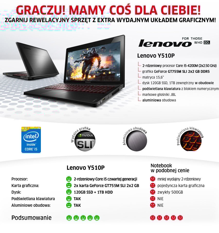 | Technologia NVIDIA SLI to rewolucyjna i nowatorska platforma, która pozwala zwiększenie wydajności graficznej poprzez łączenie mocy kilku kart graficznych NVIDIA. Dzięki zastosowaniu dwóch kart graficznych w notebooku Lenovo, technologia NVIDIA SLI zapewnia do 2 razy wyższą wydajność niż w przypadku korzystania z pojedynczej karty graficznej. |