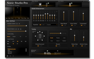 Przejmij pełną kontrolę nad dźwiękiem dzięki Sonic Studio Pro! Xonar U7 Echelon Edition wykorzystuje najnowszy pakiet oprogramowania Sonic Studio Pro, dzięki któremu otrzymujesz pełną kontrolę nad każdym aspektem dźwięku - od equalizera (EQ) po 7.1-kanałowe równoważenie poziomu brzmienia. Intuicyjny interfejs z fabrycznie utworzonymi profilami ustawień może zostać dopasowany do różnych środowisk dźwiękowych oraz do regulacji ustawień Dolby® Home Theater 4. |
