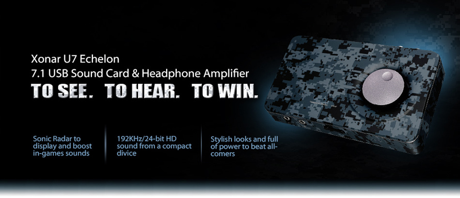 Zobaczyć, usłyszeć, wygrać Xonar U7 Echelon Edition - kompaktowa, 7.1-kanałowa karta dźwiękowa USB, która utrzymuje wysoką jakość dźwięku znaną z nagradzanego Xonar U7 i wykorzystuje wojskowy kamuflaż typu „digital”, unikatowy dla serii Echelon. Xonar U7 Echelon Edition wyróżnia się swoim stylowym wyglądem i brzmieniem. Inżynierowie firmy ASUS wyposażyli urządzenie w pełny zestaw funkcji, dzięki którym gracz więcej widzi, słyszy i wygrywa Xonar U7 pokonuje ograniczenia związane z przestrzenią i zasilaniem, z którymi mają problem inne zewnętrzne urządzenia dźwiękowe USB, oferując precyzyjny, 7.1-kanałowy dźwięk surround. Przetwarzanie dźwięku 192kHz/24-bit HD zapewnia jednolitą jakość na wszystkich kanałach. |