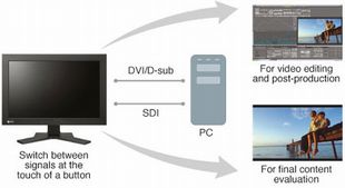 ColorEdge CG232W oferuje wiele funkcji spełniających wymagania stawiane urządzeniom do post-produkcji, obejmujących płynną gradację barw, ocenę gotowego materiału lub nieliniową edycję video na potrzeby stacji telewizyjnych. Za pomocą jednego przycisku na przedniej ściance monitora można przełączać się między źródłami sygnału PC i SDI, co umożliwia wykorzystanie jednego urządzenia zarówno do edycji materiału, jak i referencyjnego odtwarzania i oceny.