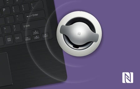 Dotknij, aby udostepnic Funkcja łączenia jednym dotknięciem przez NFC umożliwia szybkie, bezprzewodowe przesyłanie muzyki z komputera VAIO do domowych głośników lub do słuchawek. Do połączenia urządze |