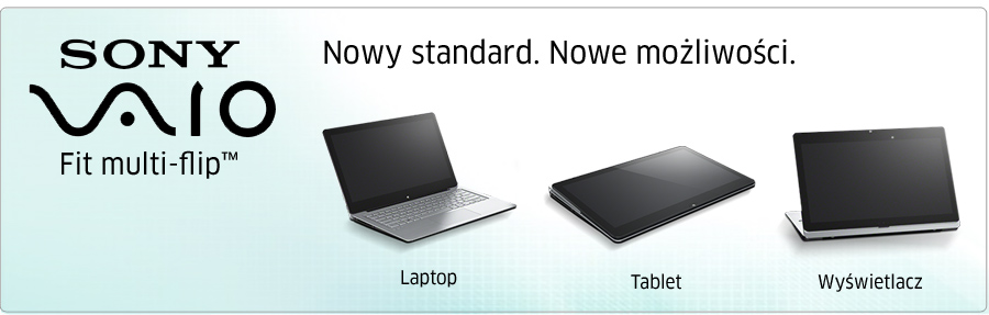 Jeden obrót — inna funkcja Teraz laptop będzie jeszcze ciekawszy w użyciu. Dzięki nowej konstrukcji Sony multi-flip modele VAIO Fit multi-flip błyskawicznie zmieniają się ze zwykłego laptopa w tablet albo w wyświetlacz. To innowacyjne rozwiązanie wymyślono po to, by zapewnić znakomite wrażenia zarówno przy korzystaniu z ekranu dotykowego, jak i z konwencjonalnego notebooka. |