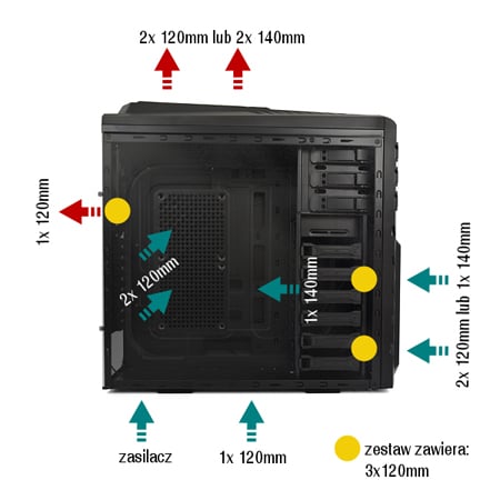 Rozbudowana wentylacja zapewni im optymalne temperatury nawet podczas długich rozgrywek. Trzy załączone 120 mm wentylatory zapewniają znakomity przepływ powietrza, a zintegrowany regulator obrotów pozwala na sterowanie aż dziewięcioma(!) wentylatorami.