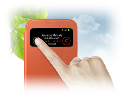 | Etui S View posiada przezroczysty otwór na ekran, umożliwiając użytkownikom podgląd takich informacji jak data, godzina, numer połączenia przychodzącego, połączenia nieodebrane, SMS-y, stan naładowania baterii oraz dostęp do panelu odtwarzacza muzyki – a wszystko to bez konieczności otwierania etui. | |