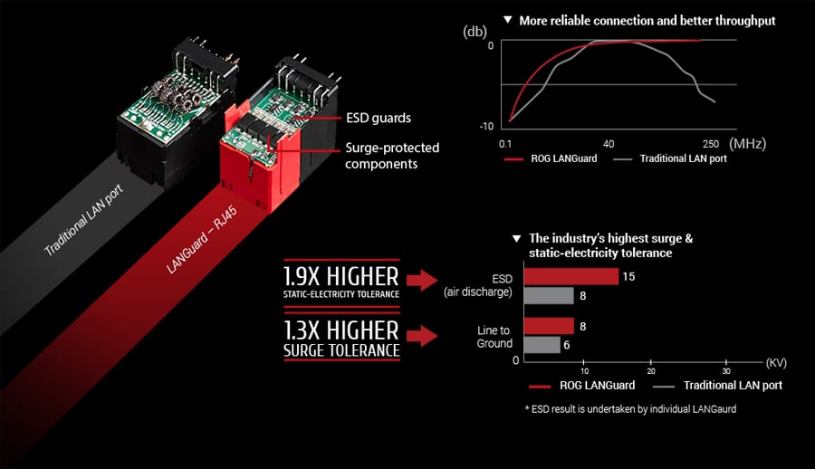 ![]() Podkręcona przepustowość. Najlepsza ochrona przeciwprzepięciowa. ROG wymyślił na nowo gniazdo LAN. Zaawansowana technologia parowania sygnału oraz wysokiej jakości kondensatory montowane powierzchniowo zwiększają przepustowość, podczas gdy komponenty chronione przed przepięciami i elektrostatyką (strażnicy ESD Guards) zabezpieczają Twą płytę główną przed uderzeniami pioruna i elektrycznością statyczną! |