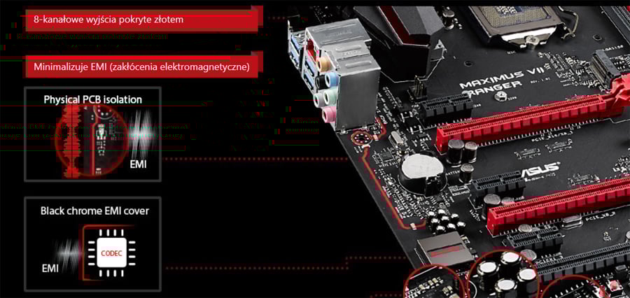 ![]() Precyzyjnie dopracowany dźwięk, który jest równie dobry, jak z wydzielonej karty dźwiękowej ROG rozumie znaczenie nieskazitelnego audio — wspaniałe efekty i bogata ścieżka dźwiękowa to podstawy gry. Dlatego właśnie inwestujemy znaczące siły inżynieryjne w doskonalenie dźwięku z płyty głównej. Efektem jest SupremeFX. Najwyższej klasy rozwiązania izolujące minimalizują zakłócenia elektromagnetyczne (EMI), a najlepsze podzespoły zapewniają najlepsze audio w swej klasie, które jest równie dobre, co z wydzielonej karty dźwiękowej. Jednakże my nigdy nie spoczywamy na laurach, dlatego też SupremeFX 2014 została jeszcze bardziej dopracowana w płytach głównychr Maximus VII. To oznacza jeszcze lepsze komponenty i niezwykle sprytne innowacje w oprogramowaniu, by doznania w grach i multimediach były nieporównywalne! |