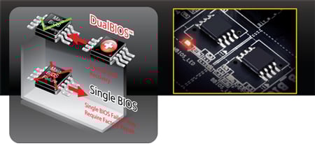 Płyty główne GIGABYTE Ultra Durable™ posiadają ekskluzywną technologię od GIGABYTE, która chroni jeden z niewątpliwie najważniejszych komponentów komputera - BIOS. GIGABYTE DualBIOS™, oznacza ze płyta główna obok podstawowego układu BIOS posiada drugi, zapasowy. Sprawia to, że użytkownik jest zabezpieczony przed uszkodzeniem BIOSU przez atak wirusa, usterkę sprzętowa, niewłaściwe próby podkręcania czy błędu aktualizacji spowodowanego nagłą utratą zasilania. |