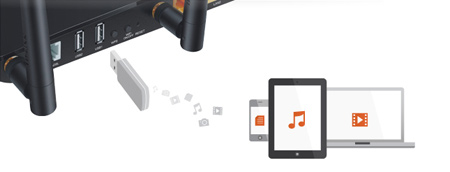 2 porty USB - łatwe udostępnianie dysków i drukarek Używając dwóch wielofunkcyjnych portów USB 2.0 użytkownicy mogą udostępniać drukarki, dane oraz multimedia urządzeniom w domowej sieci oraz, przy użyciu funkcji serwera FTP, przez Internet. |