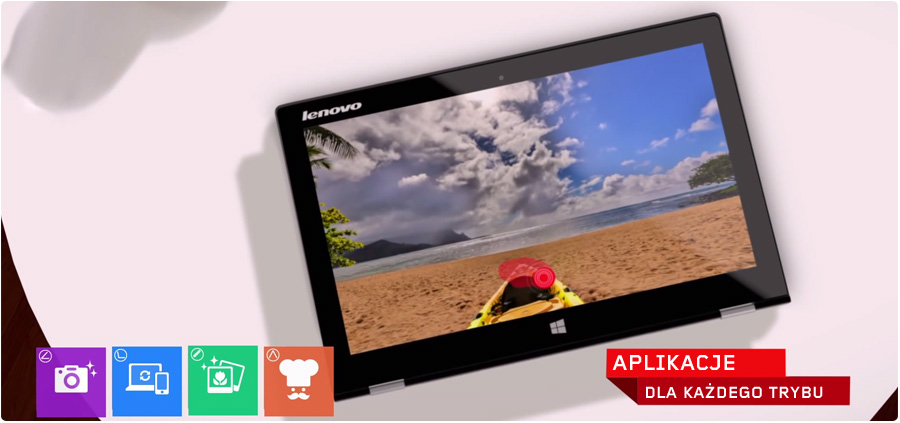| Urządzenie Yoga 2 jest wyposażone w niestandardowe oprogramowanie, które pozwala w maksymalnym zakresie wykorzystać każdy tryb pracy. Nasze wyjątkowe oprogramowanie rozpoznaje bieżący tryb pracy i poleca aplikacje, które najlepiej się do niego nadają (oznaczone hasłem Lenovo Recommends). Domyślnie zainstalowane aplikacje, takie jak Phone Companion, Camera Man, Photo Touch i Chef, zapewnią Ci maksimum wydajności w każdym trybie i największe możliwości rozrywki. | |