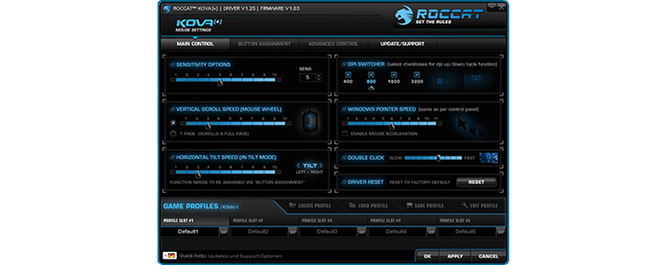 Wszystkie funkcje myszy Kova+ Gaming łatwo ustawia się w dedykowanym oprogramowaniu Roccat, którego obsługa jest naprawdę intuicyjna.