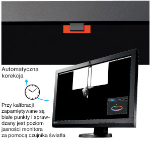 Do przeprowadzenia pierwszej kalibracji monitora konieczny jest zewnętrzny kalibrator, natomiast wbudowany w ColorEdge CX241 czujnik wraz z dostępnym opcjonalnie oprogramowaniem ColorNavigator czuwa nad tym, aby wybrane ustawienia zachowywane były na tym samym poziomie. Czujnik ukryty jest w górnej części obudowy i wysuwa się tylko wtedy, gdy zgodnie z harmonogramem sporządzonym przez użytkownika, należy dokonać kontroli ustawień. Nawet jeśli monitor jest wyłączony lub nie jest podłączony do komputera, czujnik wysunie się samoczynnie o czasie i dokona samokontroli. |