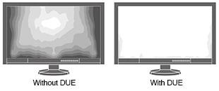 Kontrola równomierności podświetlenia oraz koloru na całej powierzchni matrycy (DUE) Uzyskanie równomiernego podświetlenia oraz jednorodnego koloru na całej powierzchni matrycy było dotychczas niemal niemożliwe w monitorach LCD. Rozwiązaniem tego problemu jest kolejna wersja opracowanego przez inżynierów EIZO układu ASIC (Application Specific Integrated Circuit) dokonująca w czasie rzeczywistym korekt wyświetlanego obrazu tak, aby w monitorach opuszczających fabrykę w Japonii, współczynnik Delta-E opisujący nierównomierność był na minimalnym poziomie. Obecnie technologia DUE utrzymuje również na tym samym poziomie temperaturę barw i jasność, w sytuacjach, kiedy zmienia się temperatura otoczenia. |