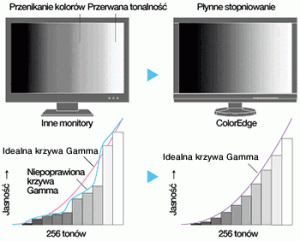 Krzywa gamma w monitorach ColorEdge CX241 jest regulowana indywidualnie w fabryce Dokładne odwzorowanie krzywej gamma każdej z barw podstawowy jest warunkiem poprawnego wyświetlania wszystkich kolorów. Monitory EIZO z serii ColorEdge już podczas procesu produkcji mają precyzyjnie dobrane barwy składowe w całym zakresie od 0 do 255 odcienia. Dokonywane jest to poprzez pomiar wartości gamma dla każdego z kolorów podstawowych (Red, Green, Blue) oddzielnie, a następnie – przy wykorzystaniu zaszytej w elektronice 16-bitowej tabeli barw Look-Up Table (LUT), wybór najbardziej pasujących 256 odcieni. |