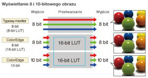 Jednoczesne wyświetlanie kolorów z palety 10-bitowej Przy podłączeniu poprzez DisplayPort przez złącze sygnałowe możliwe jest dostarczanie do ColorEdge CX241 10-bitowej informacji o kolorze*. Monitor korzystając z 16-bitowej tablicy LUT, przetwarza informacje o kolorze z 16-bitową precyzją, co pozwala na uzyskanie bardziej płynnych przejść tonalnych i zmniejszenie Delta-E pomiędzy poszczególnymi punktami. To o 64 razy większa precyzja niż w przypadku 16,7-milionowej palety barw, jaką oferuje sygnał 8-bitowy. * Konieczna jest karta graficzna i oprogramowanie, obsługujące 10-bitowy sygnał. |