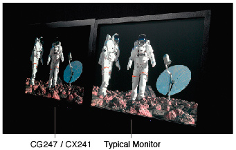 Doskonałe odwzorowanie odcieni, również w ciemnych partiach Z uwagi na charakterystykę podświetlenia monitorów LCD, podczas oglądania ekranu pod kątem, w słabo oświetlonym pomieszczeniu, ciemne odcienie zazwyczaj wydają się wyblakłe. Monitor ColorEgde CX241 utrzymują wysoki współczynnik kontrastu, nawet patrząc na monitor pod kątem. |