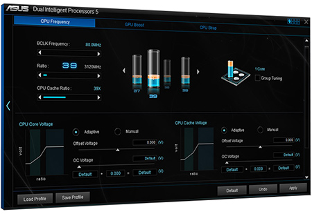 Uwolnij całą wydajność swego komputera zwykłym przełącznikiem dwustanowym na płycie głównej albo narzędziem ASUS AI Suite 3! Układ Turbo Processor Unit (TPU) oferuje precyzyjną kontrolę napięcia i zaawansowane monitorowanie CPU i karty graficznej, dając wielką swobodę w regulacji częstotliwości CPU i mnożników, co przekłada się na zoptymalizowaną wydajność i wykorzystanie całego potencjału karty graficznej*. |