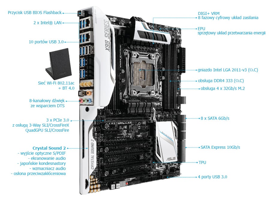 Ta płyta główna obsługuje procesory Intel® Core™ i7 z podstawką LGA2011-v3 oraz zintegrowanymi kontrolerami pamięci i magistrali PCI Express współpracującymi z czterokanałową pamięcią DDR4 (8 modułów DIMM) i 40/28 szynami PCI Express 3.0/2.0. |