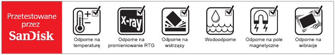 Wszystkie produkty SanDisk zostały wykonane w zgodzie z najwyższymi standardami i rygorystycznie przetestowane w każdej fazie produkcji. Możesz zaufać wyjątkowej jakości, wydajności i niezawodności każdego produktu SanDisk.