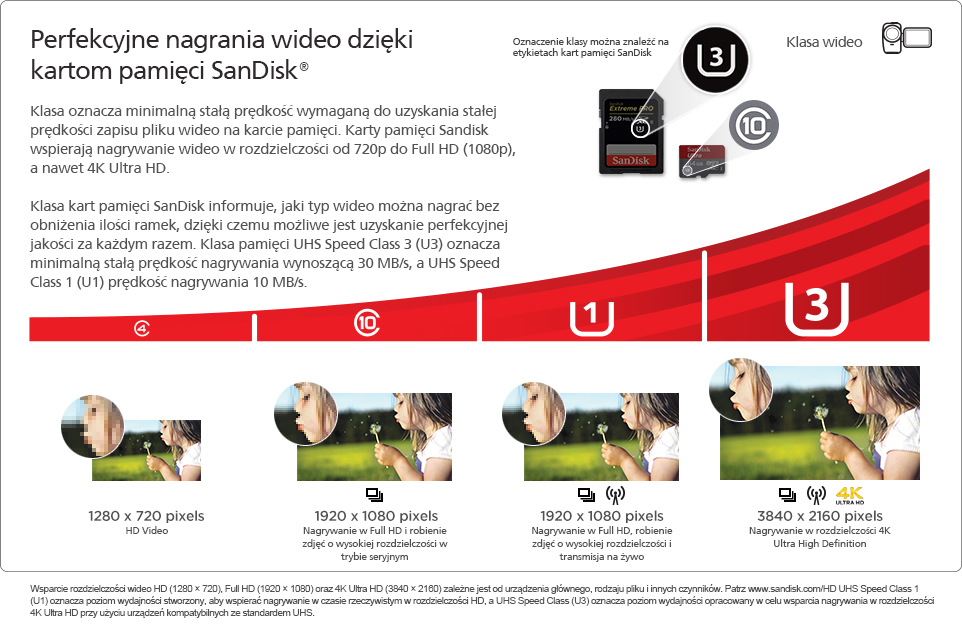 2Wsparcie rozdzielczości wideo Full HD (1920x1080) oraz 4K Ultra HD (3840 × 2160) zależne jest od urządzenia głównego, rodzaju pliku i innych czynników. Więcej informacji na www.sandisk.com/HD