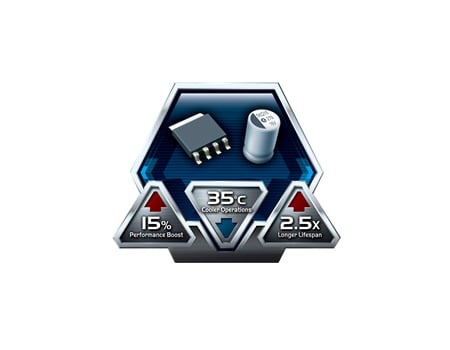 Specjalnie opracowany stop zwiększa wydajność, redukuje straty energii, zwiększa wytrzymałość i zapewnia niższa temperaturę pracy. Dławiki eliminują dźwięk brzęczenia przy pełnym obciążeniu, a kondensatory zapewniają żywotność rzędu 50 000 godzin - to 2,5-krotnie więcej, niż tradycyjne kondensatory..