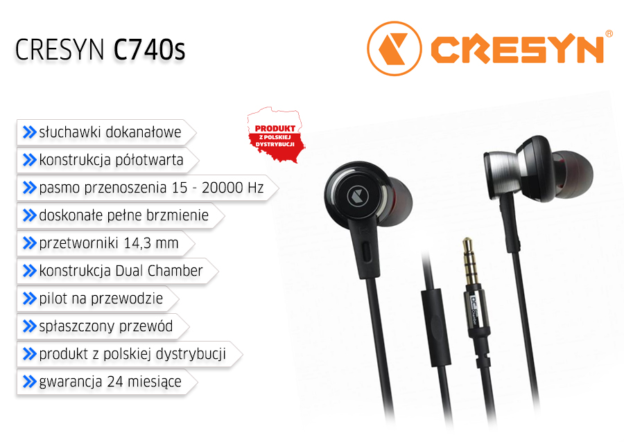 Model C740S wyposażony jest w pilot i mikrofon umieszczone na przewodzie. Pilot z mikrofonem jest mały, ale doskonale się sprawdza podczas odbierania i prowadzenia rozmów. Innowacyjny w tym modelu jest również przewód, nie jest on płaski ani także typowy o przekroju koła, przewód w nowych Cresynach jest spłaszczony przez co zachowuje najlepsze cechy obu wcześniej wymienionych typów. |
