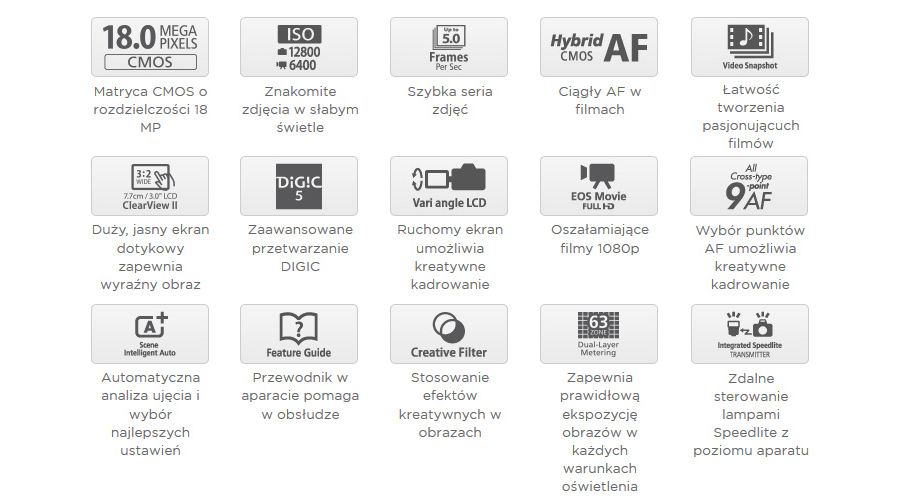 Filmy w rozdzielczości Full HD Aparat umożliwia rejestrowanie filmów w rozdzielczości 1080p, a użytkownik sam decyduje o zakresie automatycznych i ręcznych ustawień. Technologia Hybrid AF umożliwia ciągłą regulację ostrości podczas filmowania, a aparat EOS 700D obsługuje niemal bezgłośny mechanizm Movie Servo AF w przypadku zgodnych obiektywów STM. Mikrofon wbudowany lub zewnętrzny umożliwia nagrywanie dźwięku stereo. |