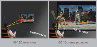 Jak powszechnie wiadomo, im większy obraz tym lepszy efekt 3D - aby osiągnąć najlepsze wyniki kluczowe jest wypełnienie pola całego pole widzenia, bez konieczności siedzenia zbyt blisko ekranu. Nawet ogromne 50" telewizory mogą stworzyć tylko okno do świata 3D, podczas gdy efekt głębi i emocje oferowane przez przez ogromny 150" ekran projekcyjny pozwalają ci poczuć, że jesteś częścią akcji!