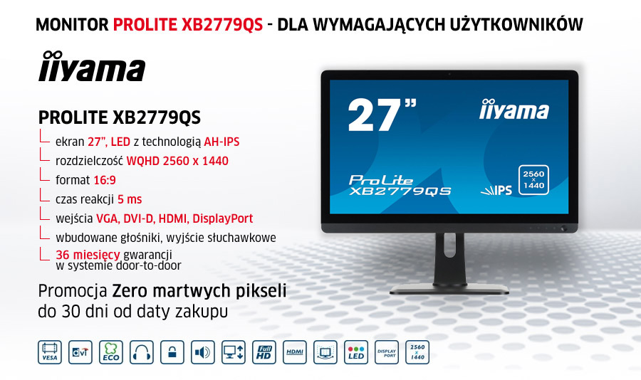 Stylowy, 27-calowy monitor LED z matrycą AH-IPS, rozdzielczością WQHD 2560 x 1440 i stopką z regulacją wysokości. iiyama XB2779QS ma rozdzielczość natywną WQHD, co oznacza, że na ekranie zmieści się blisko 77% informacji więcej niż w przypadku monitora Full HD. Daje to prawdziwy komfort pracy z wieloma aplikacjami, czy rozbudowanymi arkuszami. Matryca AH-IPS gwarantuje najwyższą jakość obrazu, doskonałe odwzorowanie kolorów i szybki czas reakcji. Szeroki wachlarz wejść obejmujący złącza HDMI, DisplayPort, DVI i VGA zapewnia kompatybilność z szeregiem różnych urządzeń. iiyama XB2779QS to połączenie stylowej, nowoczesnej formy i najlepszych specyfikacji. |