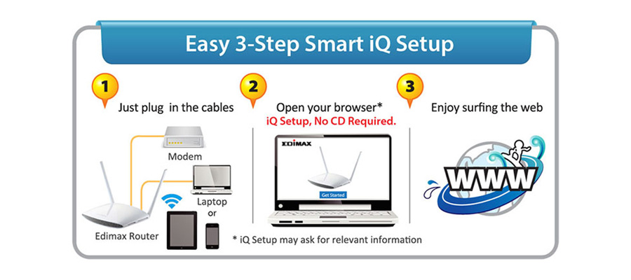 Funkcja iQ Setup, obsługiwana z poziomu przeglądarki internetowej, umożliwia szybką konfigurację urządzenia. Uciążliwa do tej pory konfiguracja teraz wynaga jedynie kilku kliknięć.