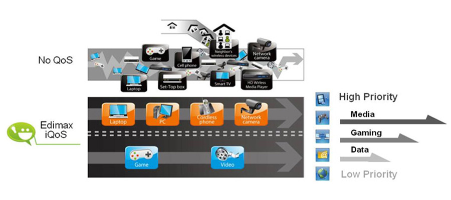 Rewolucyjny "iQoS" jest odpowiedzią na potrzebę łatwego, szybkiego i bardziej efektywnego zarządzania połączeniami. Dzięki iQoS gry on-line, streaming wideo, używanie VoIP oraz BT w tym samy czasie nie będzie już problemem. To prosty i intuicyjny interfejs umożliwiający skonfigurować priorytety dla programów.