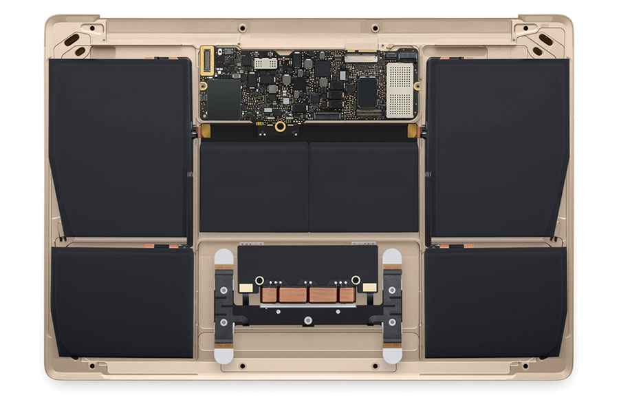 Użytkownicy sprzętu Apple potrzebują notebooka, na którym można pracować cały dzień, niezależnie od tego, jak bardzo jest kompaktowy. A w przypadku smukłej obudowy nowego MacBooka niezakłócona praca przez cały dzień nie byłaby możliwa, gdybyśmy użyli tradycyjnych prostokątnych baterii. Dlatego opracowaliśmy unikalną technologię, zaprojektowaną tak, by wykorzystać każdy milimetr sześcienny baterii. W efekcie powstała specjalnie wyprofilowana, kaskadowa konstrukcja, która idealnie mieści się w nowym MacBooku i jest absolutnie nowatorskim rozwiązaniem. |