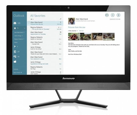 Ekran o przekątnej 23" komputera All -in-One zajmuje zdumiewająco mało miejsca na biurku, ladzie lub w centrum rozrywki. Urządzenie jest wyposażone w system prowadzenia przewodów w sposób zorganizowany, dostępne jest w 2 kolorach z cienką metalową podstawką w kształcie litery V.