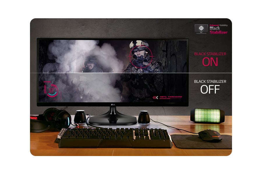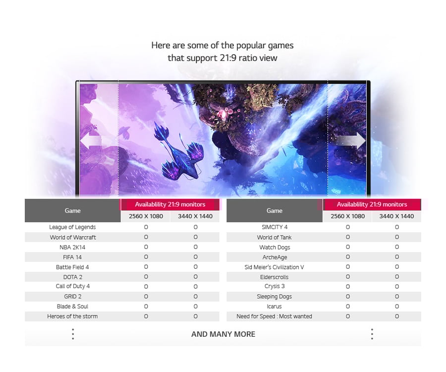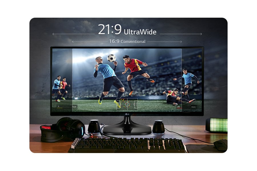 UltraWide oznacza fascynujący, panoramiczny obraz. Nasz format 21:9 UltraWide pozwala na uzyskanie ultra-panoramicznego obrazu, który wypełnia całe pole widzenia. Matryca LG 21:9 pozwala doświadczyć niespotykanych dotąd wrażeń wzrokowych, nieosiągalnych dla dotychczasowych monitorów o formacie 16:9. Dla entuzjasty gier, szerszy ekran to nie tylko większa powierzchnia ekranu. Pozwala na lepsze zaplanowanie ataku, ponieważ nowy format obrazu pozwala dostrzec więcej działań przeciwnika. Nadal grasz korzystając z monitora 16:9 i masz nadzieję na zwycięstwo? Zastanów się jeszcze raz.