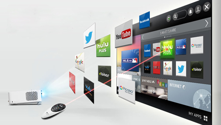 Przeglądaj media na z takich serwisów jak Netflix, VuDu, Hulu Plus, MLBTV.com, Youtube, Sportify, Vtuner, Google MAP, Facebook, Twitter, Picasa gdziekolwiek jesteś z projektorem LG PF1500 |