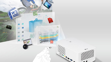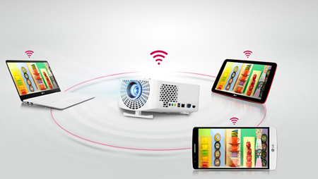 W przeciwieństwie do standardowych projektorów, funkcja LG Screen Share umożliwia bezprzewodowe przesyłanie obrazu z komputera, smartfona czy tabletu. *Funkcja LG Screen Share projektora PF1500G obsługuje jedynie urządzenia z technologią Miracast (Android)/Widi (Intel). |